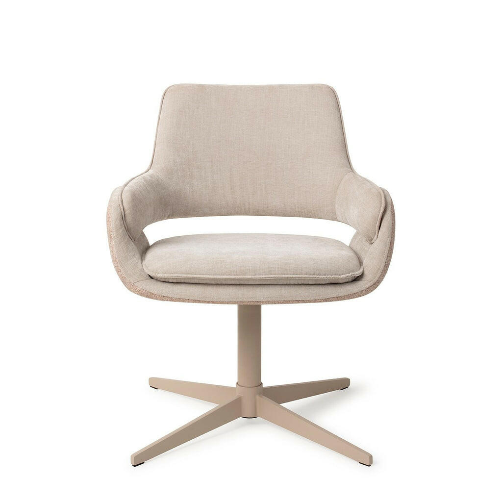 Verhoog je eetervaring met de Oketo accentstoel met tweekleurige bekleding van verschillende stoffen, gecombineerd met een bijpassend poedergecoat frame. Het frame heeft een 360 graden draaifunctie met een automatisch terugkeersysteem. De combinatie van verschillende stoffen creëert een ton-sur-ton effect in complementaire kleuren, wat een wow-factor toevoegt aan de stoel.