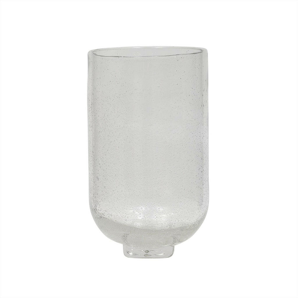The Kuki Vase in glass features bubble splashes that add a touch of whimsy to its minimalist design. Its sleek form adds a playful element to its timeless aesthetic, blending functionality with elegance. Perfect for showcasing flowers or as a standalone decorative piece. Being mouthblown, each vase will vary in size, adding to its unique charm.