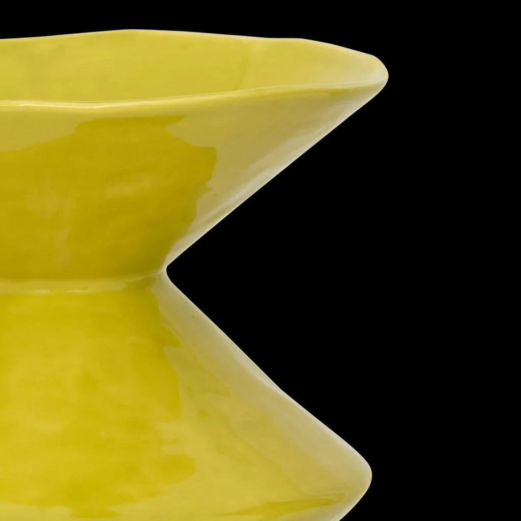 De subtiele reactieve glazuur in limoengeel geeft deze handgemaakte keramieken vaas een moderne twist. De krachtige vorm zorgt voor expressie — met bloemen of gewoon als kunstzinnige woondecoratie.